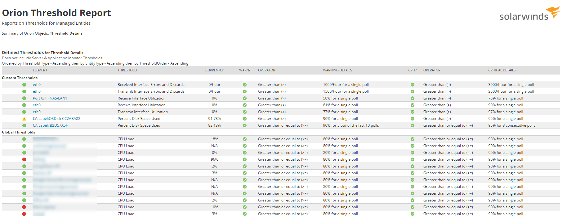 This report shows ALL the thresholds currently set for Orion monitored entities. In it's current iteration, it does not include component information from Server & Application Monitor.