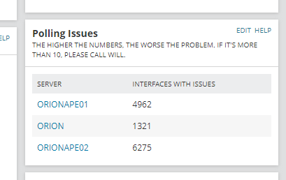 Just a simple query to show total counts for interfaces not polling, or not polling correctly. We had some issues, several years ago, with random interfaces which would simply stop collecting data, and this little widget ended up earning a spot on our main view to help us track down the problem. Since then, and because it only takes up a tiny bit of space, I decided to leave it there until something else more important comes along.