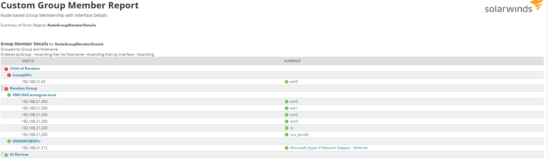 This report pulls group member (including child groups) which are Nodes. Then it pulls the list of interfaces for said nodes.