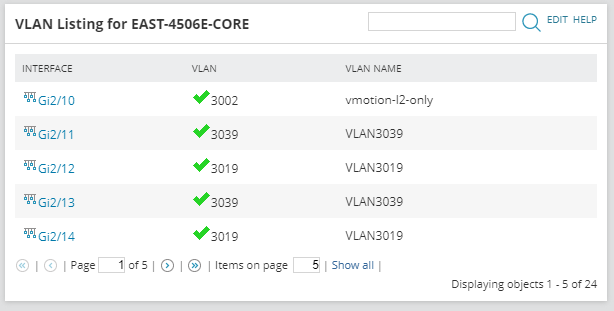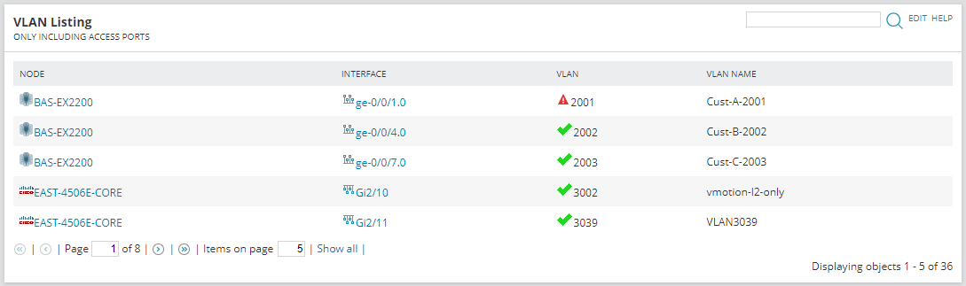 This provides a list of all interfaces with an assigned Access-level VLAN (trunks ignored). Includes icons for vendor, interface type, and a faux-status on a matching VLAN ID (as defined in the query).