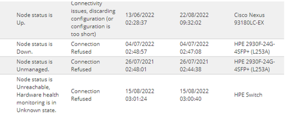 This report only shows the nodes that generated an error and what that error is. This quickly allows you to identify the nodes that are up but have issues, especially if you organise by status. It looks like this (with sensitive info removed: