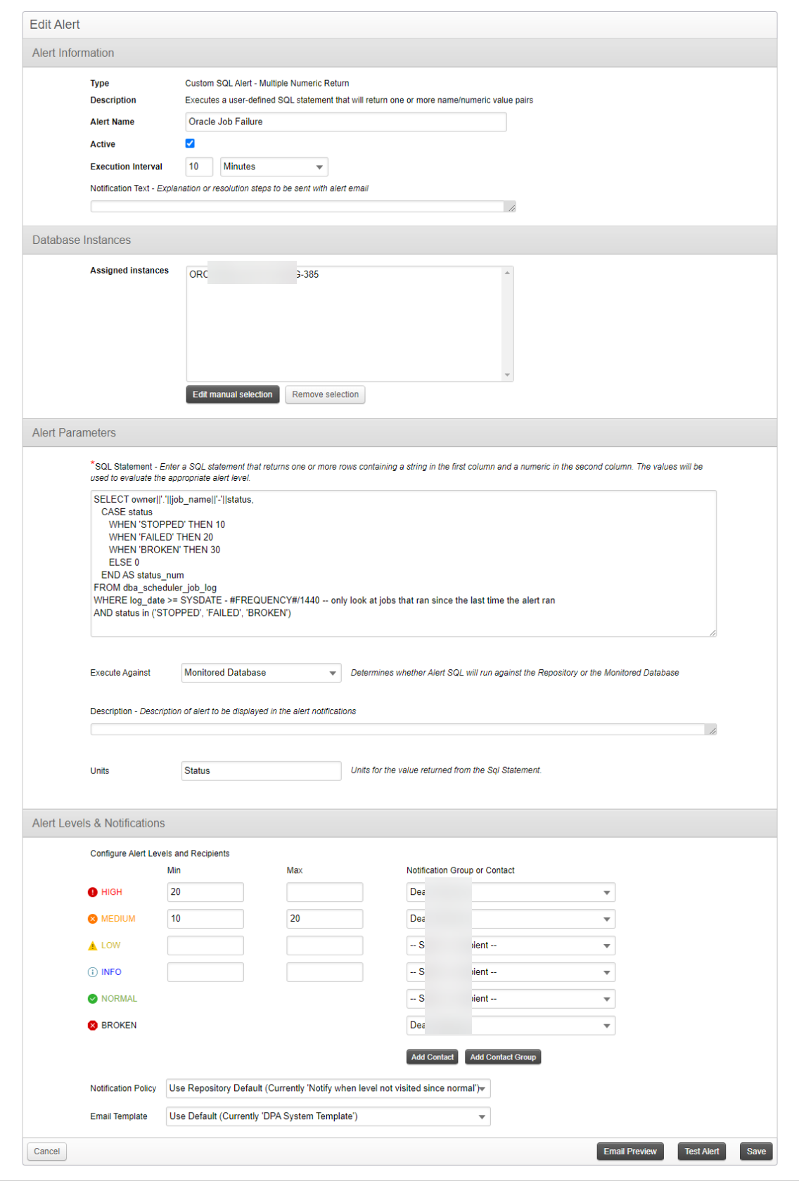 Some customers execute database jobs using DBMS_SCHEDULER and this alert will notify you of failures in those jobs. Because DPA custom alerts work with numeric returns, this SQL statement changes the status value to one of 0 (normal), 10 (stopped) or 20 (failed) in increasing severity. The thresholds in the alert should be defined accordingly.