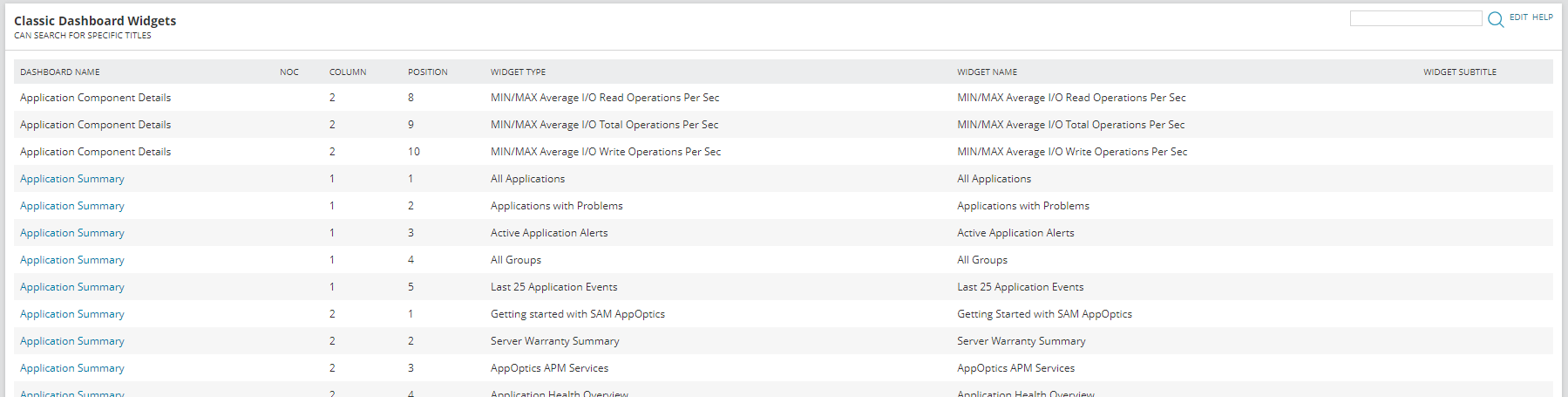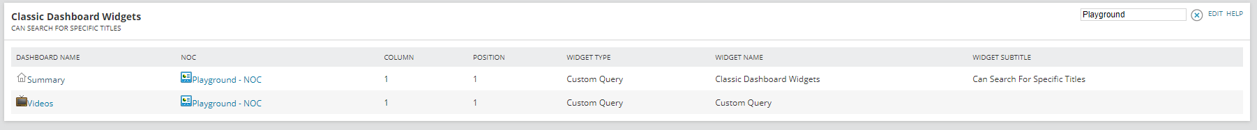 It searches the Dashboard Name, the Parent Name (if a NOC-style dashboard), the position on the page (column, and position), the Widget Type, the Widget Name (as displayed on the dashboard) and the Widget Subtitle (as displayed on the dashboard).