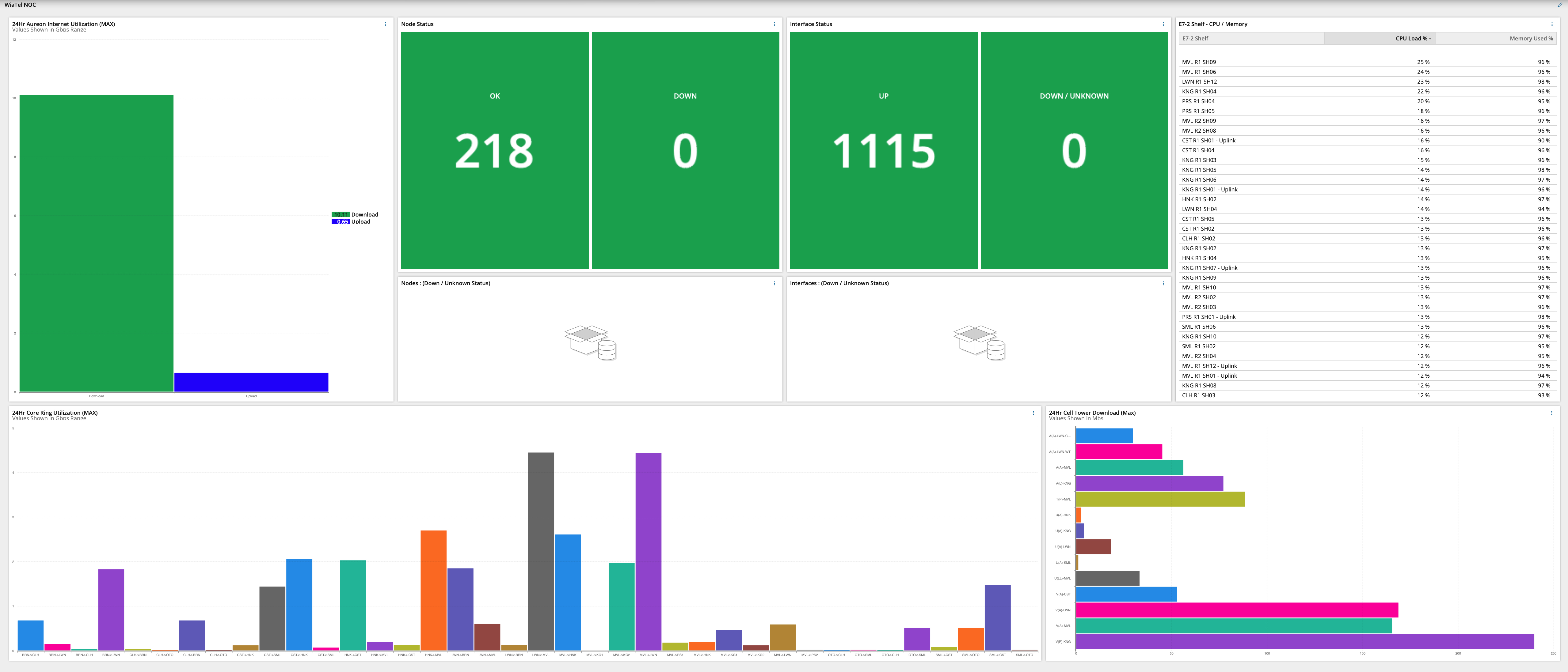 The following modern dashboard was created to breathe new life into our NOC. The dashboard specifically watches high level nodes and interfaces that are used to provide service to our 3K+ FTTH subscribers over 750square miles in rural Western Iowa.