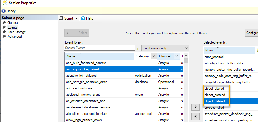 Step 1 - Either edit an existing extended event session like system_heath or create a new session and have it watch for events named object_created, object_altered, object_deleted. On some versions, these are already part of the system_health extended event session, so check there first.