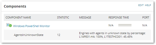 This application template runs a PowerShell script that calls into the SolarWinds API. It finds all SolarWinds Agents in an unknown state and starts monitoring that metric. The metric is cumulative across all polling engines. The message output of the script does break out each polling engine and the percentage of agents assigned to that engine with agents that have an unknown status.