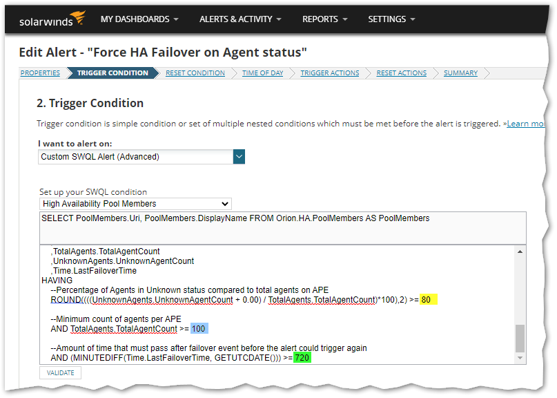 This alert uses a fairly extensive SWQL query to look for certain conditions before it triggers. You will need to update three items in this query to adapt this to your deployment.