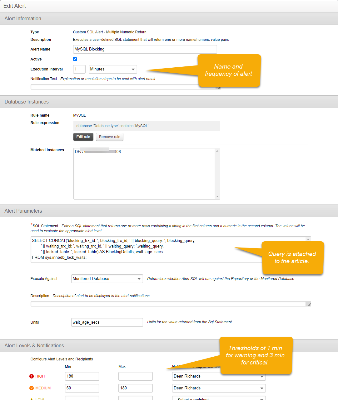 We can configure a custom alert in DPA to execute this once a minute to perform the check. Below is a screenshot of the alert and when creating it, choose Custom SQL Alert - Multiple Numeric Return. In my example, I set thresholds for warning and critical at 1 minute (60 seconds) and 3 minutes (180 seconds), but adjust accordingly for your requirements. The thresholds will be compared to the value of wait_age_secs column that is the 2nd column of the query above.