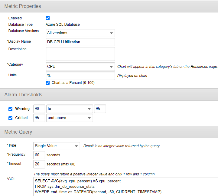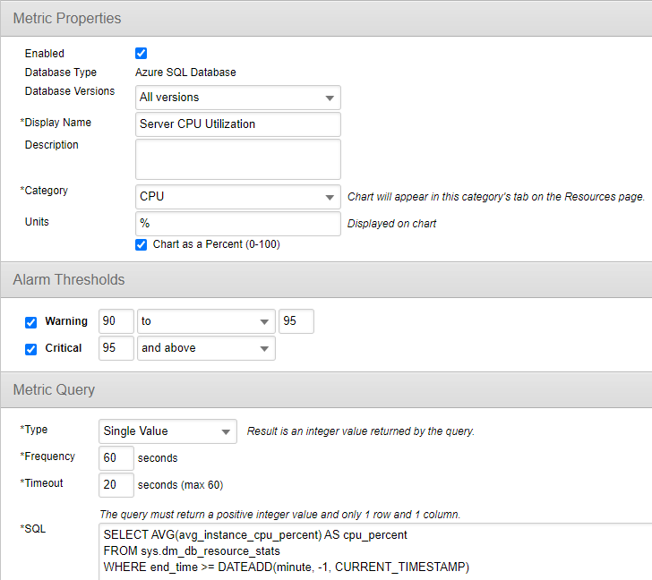 DPA currently collects and displays DTU metrics for Azure SQL Databases. However, if you're using the vCore purchasing model, those metrics are not present and will show as blank in DPA. To get the CPU Utilization metrics for your vCore system, here are some screenshots and queries that you can use as Custom Metrics in DPA. The DMV provides not only database level CPU utilization, but also exposes instance level CPU utilization as well for the times when you have multiple databases on a single server. So check out both metrics and let us know how they work.