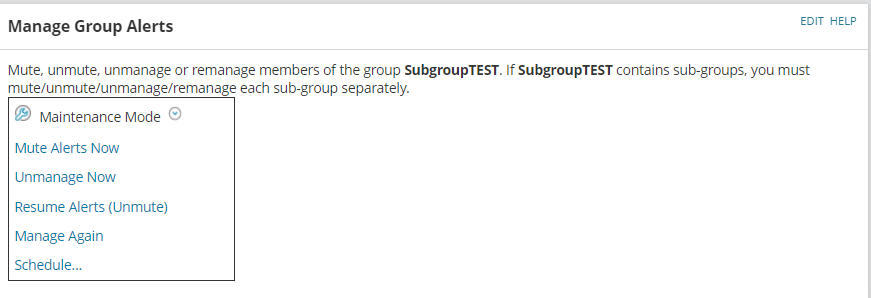 The mute/unmute links will affect all Solarwinds entity types (except other Group or Container entities, as explained above). The unmanage/remanage links only act on the entity types listed below. This is because Solarwinds' API allows any entity type to be muted, but some entity types (e.g. Components) cannot be unmanaged.