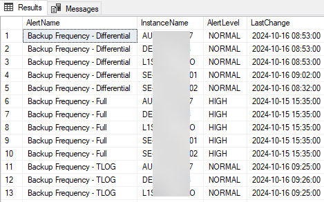 The attached script can be used to get the latest status of all alerts from the DPA repository. The result set will show the alert name, instance, latest status and last date the alert executed.