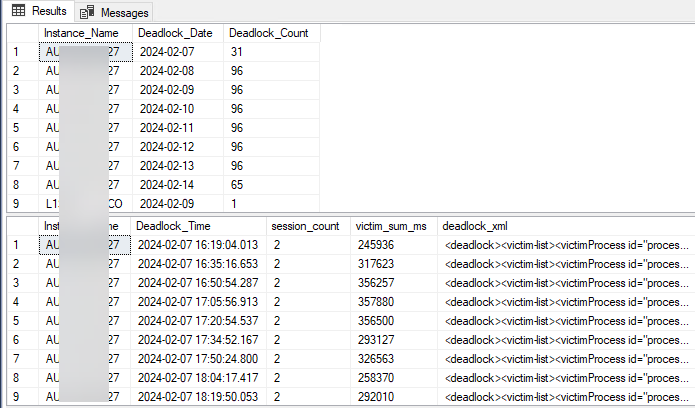 - A summary table that lists each instance, the date and number of deadlocks that occurred