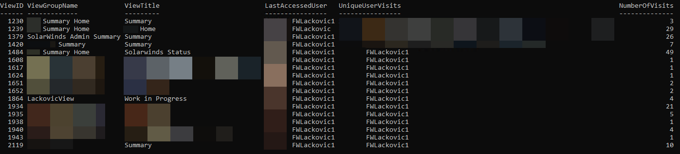 Today was a holiday and I got a bit carried away looking at all the dashboards to validate the output so they all pretty much show my username, but you can see that the UniqueUserVisits column does have more censored names than my own. Also, the first and second entries were looked at by two different accounts of mine for testing purposes.