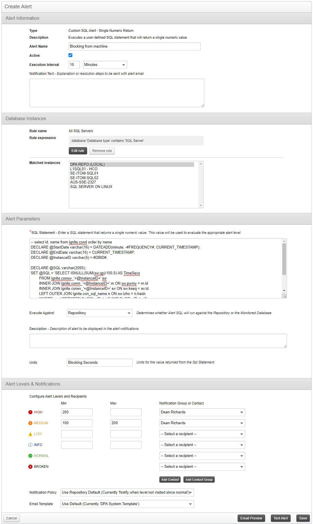 To watch for blocking that comes from a specific machine in your environment, this alert can help do that. To create it, create a Custom SQL - Single Numeric alert and make it look similar to this example. Paste in the contents of the attached script into the SQL Statement text box.