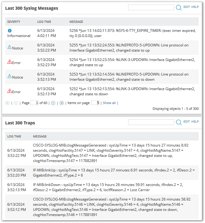 Node Details Custom Query widgets for Last 300 Syslog and Trap messages.