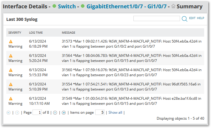 So, in this example, for syslog "flapping between port Gi1/0/2 and port Gi1/0/7", you will actually see this message in both interfaces in Interface Details View.