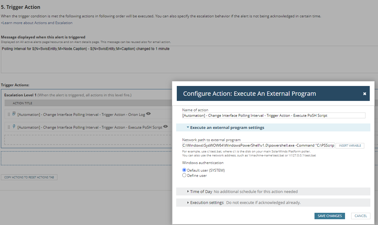 This alert is used to automatically change the polling interval of a busy interface by using a script (found in Script to change an Interface's polling interval (Used with alerting) )