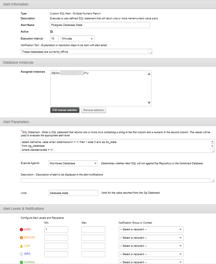 This alert will query the pg_database table and use the datallowconn value. If the value is 1, the database is not currently accepting connections and the alert query will return 1, otherwise the query returns 0.