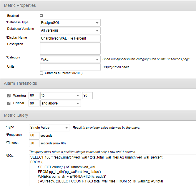 This alert is a combination of the alerts in Postgres Unarchived WAL Files and Postgres Total WAL Files to create a percentage of unarchived WAL files.