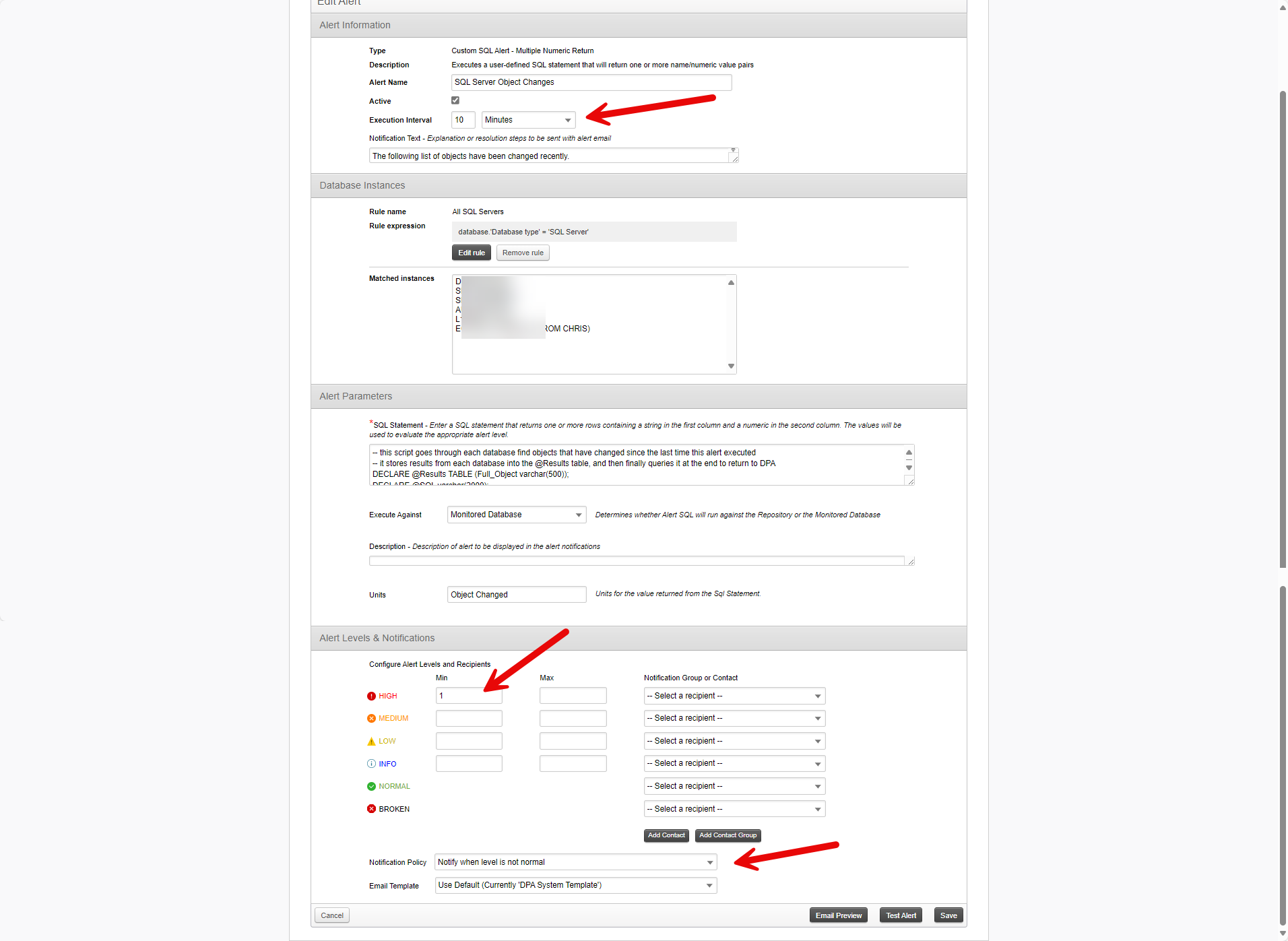 This alert will return a list of objects that have recently been modified. It uses the sys.objects table and the modify_date column for detection. This table is specific to each database, so it also loops through all non-system databases to get an instance-wide perspective.
