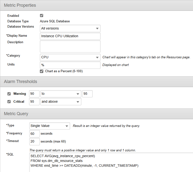 To have DPA collect these metrics, create 2 custom metrics of type single value and use the queries above. Here is an example: