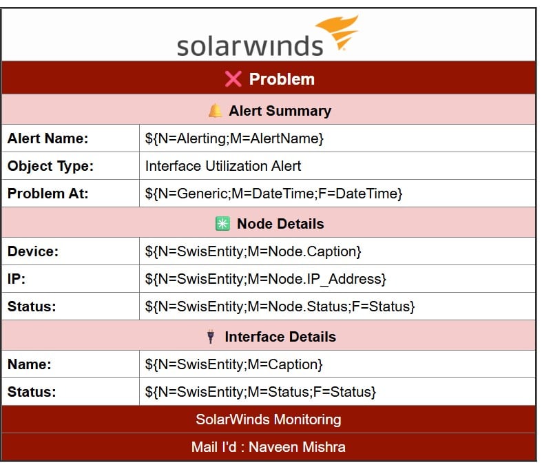 I’ve developed a custom HTML email template to enhance the visual clarity of SolarWinds alert notifications. This version focuses on Problem/Down events (Node Down or Interface Down), ensuring structured, color-coded, and mobile-friendly emails. You can easily tailor it for any other event type by adjusting the variables.