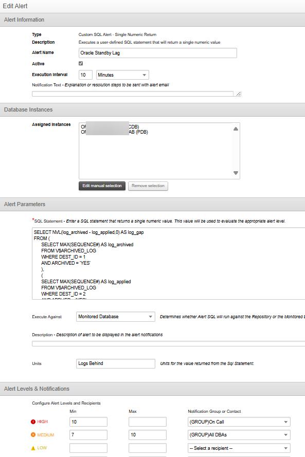 To monitor Oracle Data Guard / Standby log apply latency, you can create a custom alert in DPA using a Custom SQL – Single Numeric Return type, as shown below. Use the attached query that returns the apply lag (number of logs behind) for the standby database. This value can then be used to configure warning and critical thresholds, helping you detect when the standby is falling too far behind the primary.