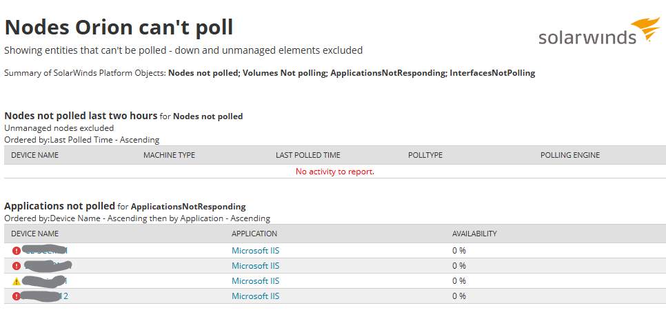 Every now and then, nodes and application can't be polled due to some reason. They might still respond to ICMP Ping, and therefor show up as Green in SolarWinds, but maybe SNMP or WMI does not work anymore. Credentials have changed, firewall rules updated or WMI needs a restart.