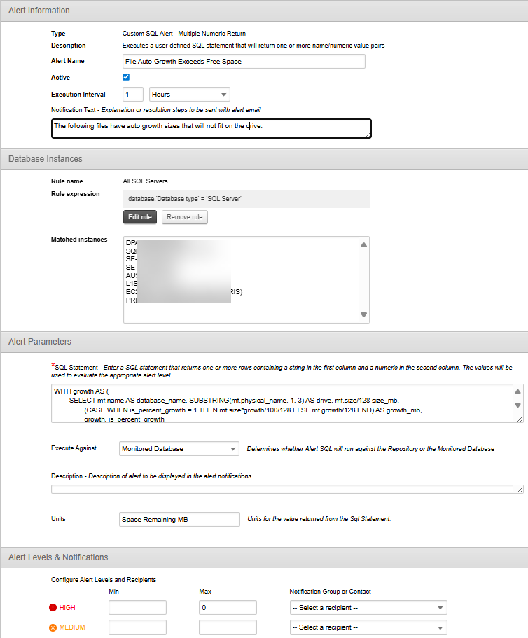 This custom alert calculates the next auto-growth size for each database file and compares it to the available free space on the corresponding drive. If there isn't enough space to accommodate the growth, it returns a negative value.