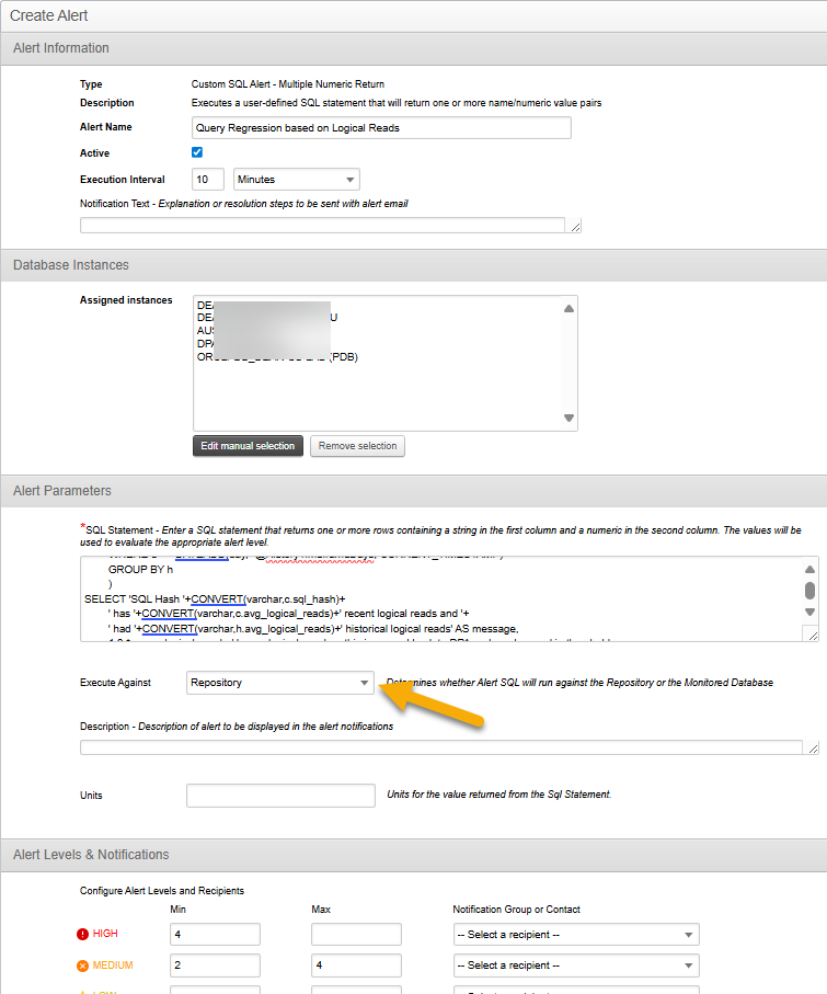 To create this alert, create a Custom SQL Multiple Numeric Return alert and configure it similar to below. Ensure it runs against the DPA Repository: