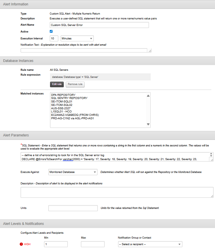DPA includes a built-in alert called "SQL Server Error Log," but it has a limitation—each error message you want to monitor requires a separate alert. To streamline this, you can use a custom alert that lets you watch for multiple error strings within a single alert configuration.