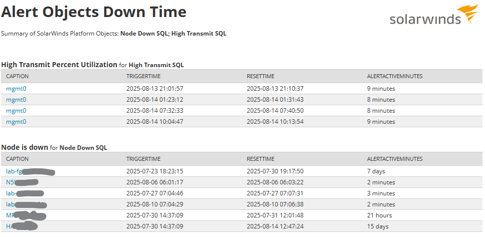 Below example is for the two alerts "High Transmit Percent Utilization" and "Node is down".