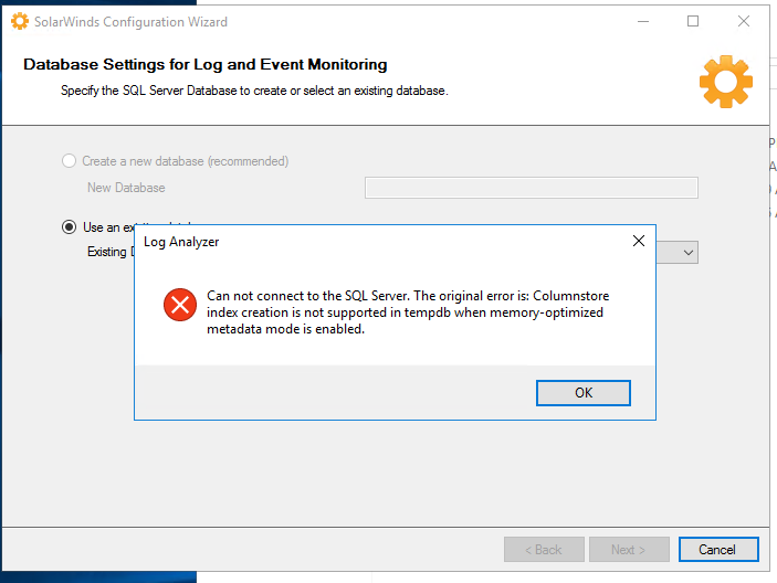 Im getting the following error on the first APE I'm upgrading. The main poller upgraded just fine, no issues were experienced when it created the new log and event database. When I get to the database settings for the log and event monitor, I get this error below. Any ideas? I have opened a ticket with SW and called the support line, but I am still on hold.