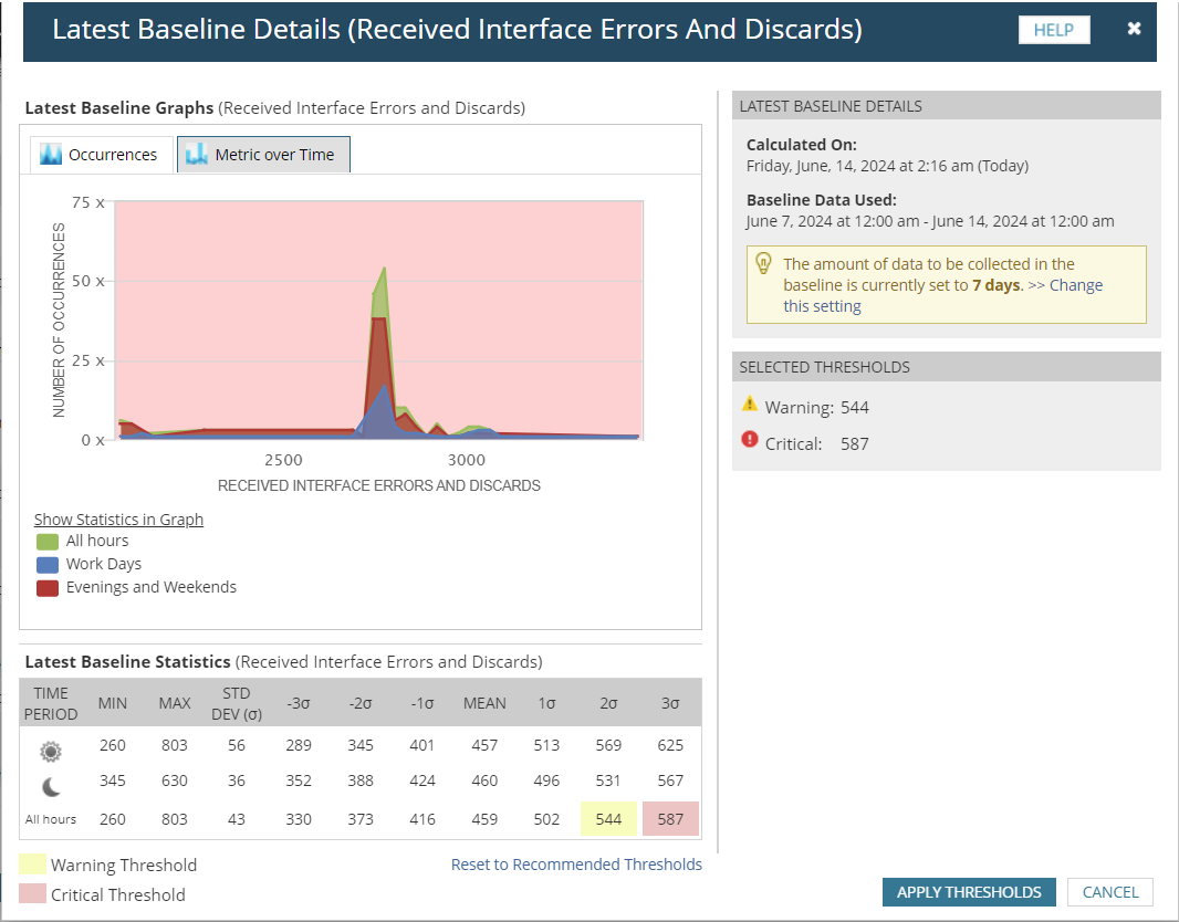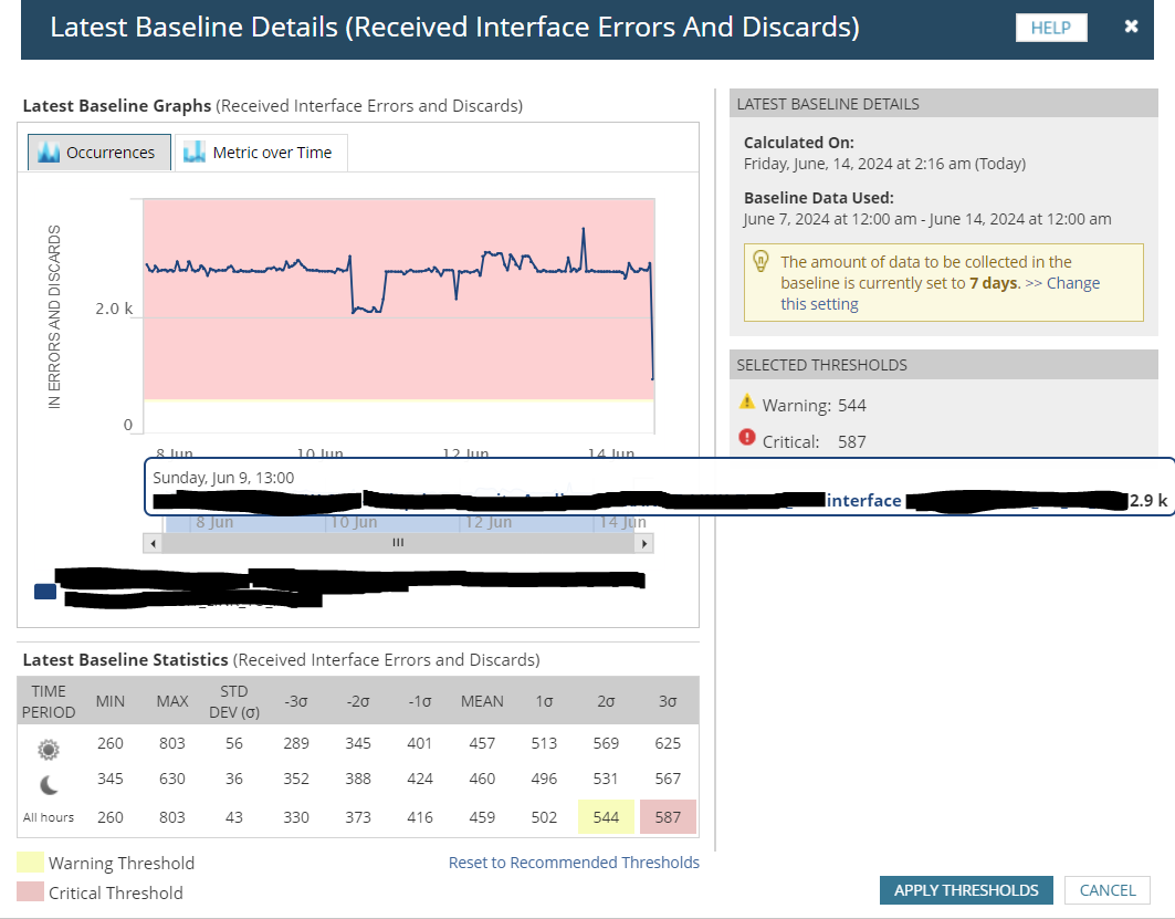 I'm not sure if I'm misunderstanding how dynamic baseline works because every time I set dynamic baseline on an interface's Received Errors/Discards, the thresholds are set much lower than what they should be.