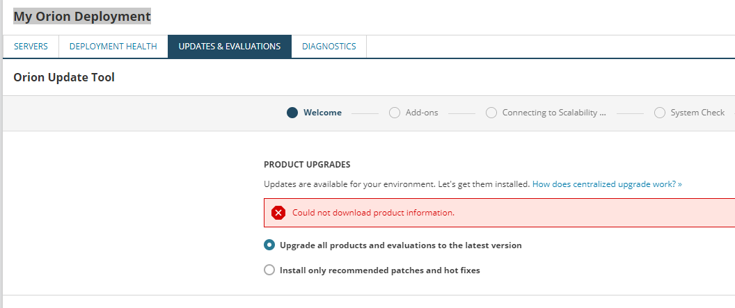 While checking in My Orion Deployment --> Updates & Evaluations --> Upgrade or Eval now, the page shows the error below