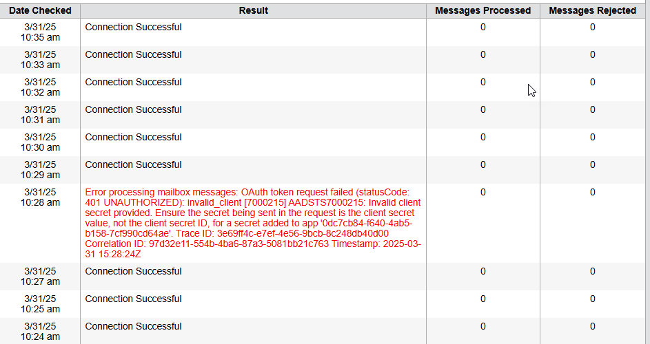 <span>Error processing mailbox messages: OAuth token request failed (statusCode: 401 UNAUTHORIZED): invalid_client [7000215] AADSTS7000215: Invalid client secret provided. Ensure the secret being sent in the request is the client secret value, not the client secret ID, for a secret added to app '0dc7cb84-f640-4ab5-b158-7cf990cd64ae'. Trace ID: 3e69ff4c-e7ef-4e56-9bcb-8c248db40d00 Correlation ID: 97d32e11-554b-4ba6-87a3-5081bb21c763 Timestamp: 2025-03-31 15:28:24Z</span>